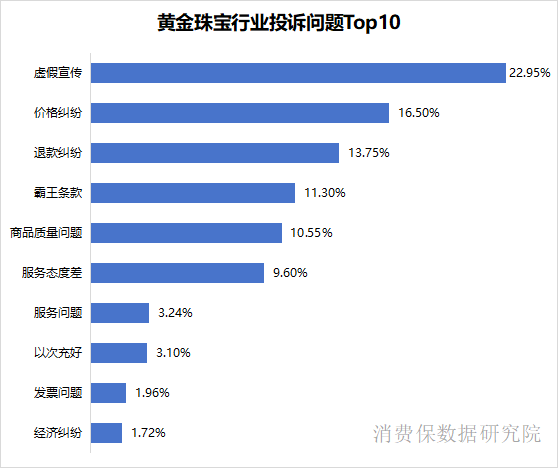 据消费保平台数据显示,黄金珠宝行业投诉问题呈现高度集中化特征,虚假宣传(22.95%)和价格纠纷(16.50%)合计占比近四成。在消费保平台搜索可以发现,尽管本刊及多家媒体都曾报道相关内容,仍有不少消费者掉入“一口价”黄金陷阱。