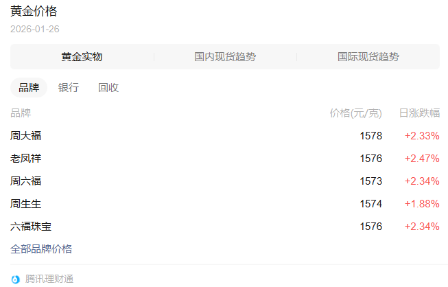 进入2026年仅不到一个月,国际金价便接连跨越4600至4900美元多个整数关口,呈现极强涨势。国内黄金消费市场上,部分主流品牌足金饰品报价已突破每克1570元。