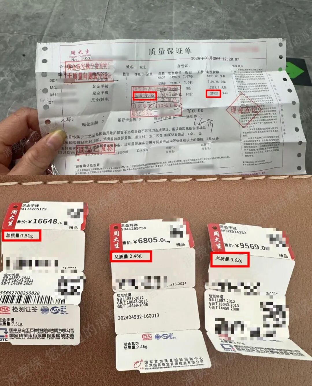 最终,在导购的引导下,连女士换购了一对耳饰、一条手链、一只手镯。拿到商品吊牌,她才发现不对劲,所有饰品总计克重只有13.61克。“差了将近9克!相当于用1900多元每克的价格买的,远超当日金价了。”连女士十分郁闷。