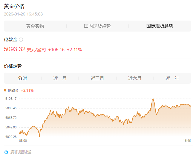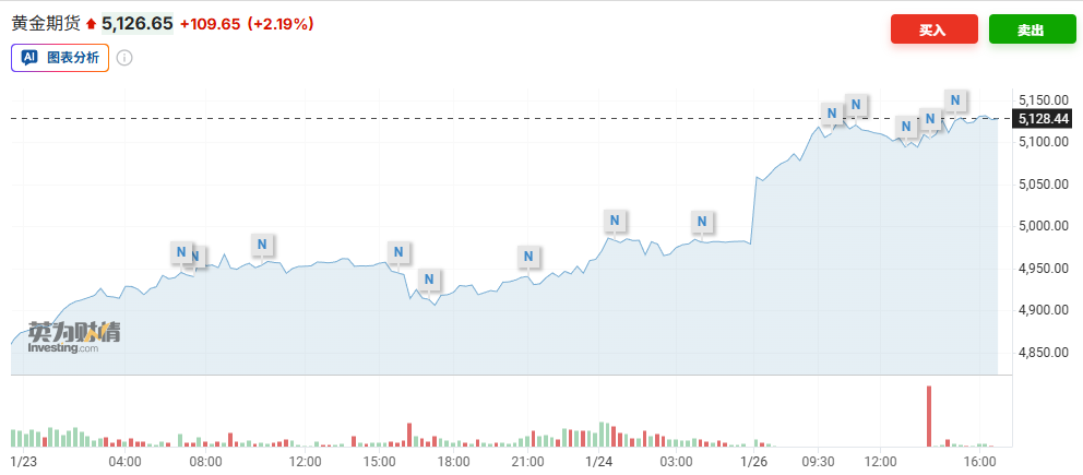黄金市场再次迎来历史性时刻。美国东部时间1月25日傍晚,纽约商品交易所2月黄金期货价格在电子盘交易中突破每盎司5000美元的历史性关口。