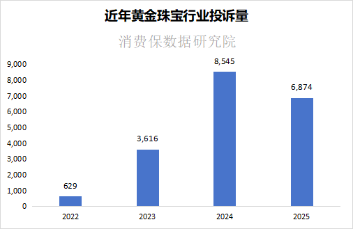 在2022年至2025年期间,消费保平台累计受理黄金珠宝行业投诉共 19,664 件。这一阶段的累计涉诉金额已超1.14亿元,有效投诉解决率为36.73%。其中,2025 年投诉量为 6,874 件,同比下降 19.56%,可以看出消费者在黄金购买上渐趋谨慎。