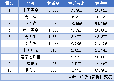 在品牌投诉处理方面,中国黄金以19.36%的投诉占比位居榜首,投诉解决率为20.02%;周六福投诉量排第二,占比16.82%,投诉解决率为15.78%;老凤祥投诉量排第三,占比10.55%,投诉解决率为94.75%,远高于行业投诉处理水平。