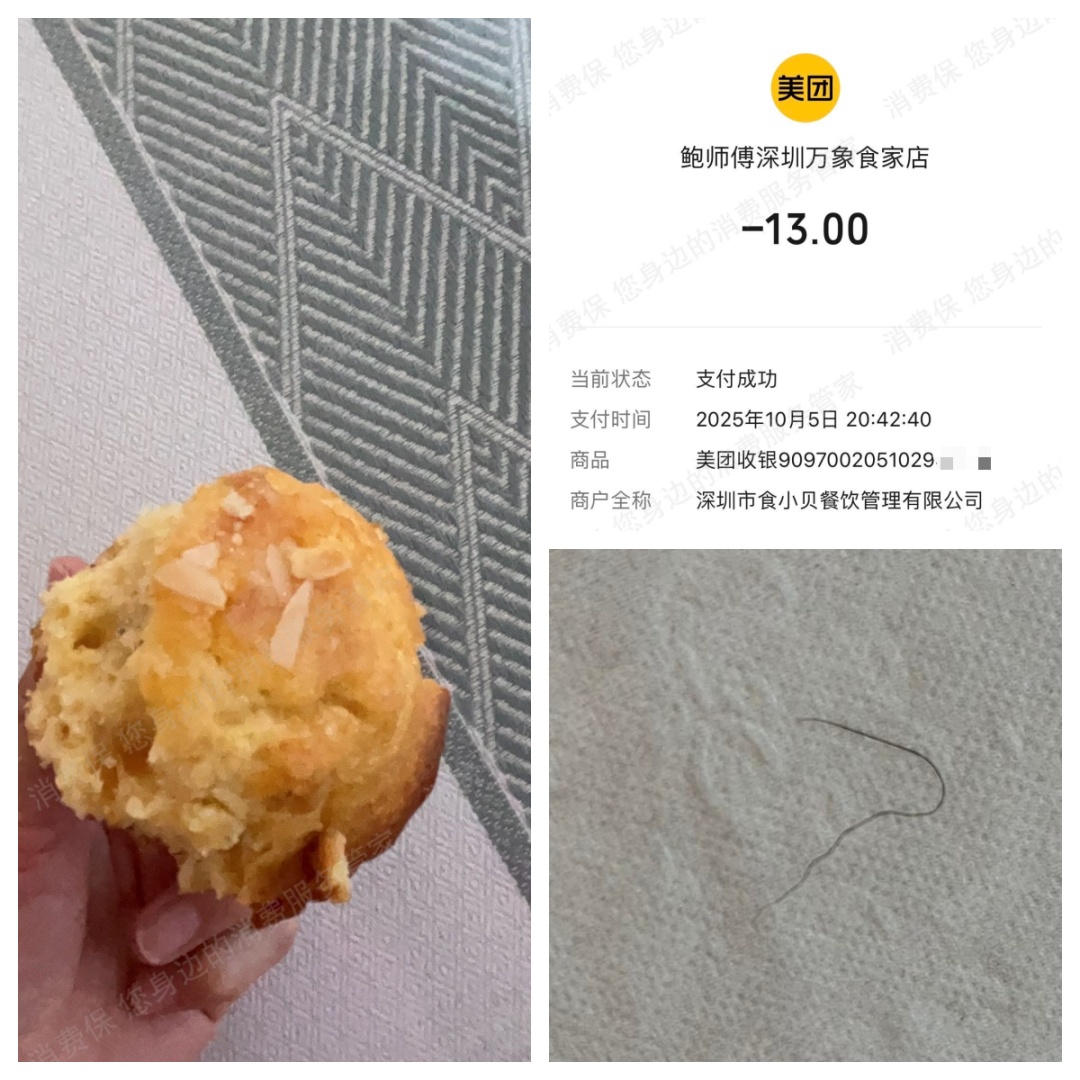 此外,有消费者反映,2025年10月6日在深圳万象食家鲍师傅门店购买一盒麦芬蛋糕,吃出一根卷曲毛发,要求退一赔三,未获品牌回应。