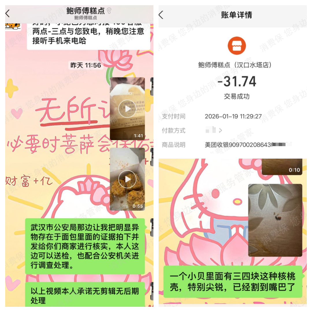 2026年1月20日,俞女士(化名)收到朋友寄的从鲍师傅汉口水塔店购买的核桃小贝。在食用时,吃出了尖锐的核桃壳,导致口腔被划伤。
