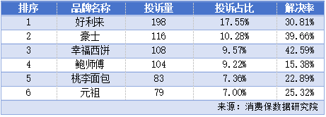 从具体品牌看:好利来以198件投诉居榜首,占比17.55%;而被众多食客追捧的鲍师傅,虽然投诉量“仅”104件,但解决率低至15.38%——在Top6品牌中垫底。