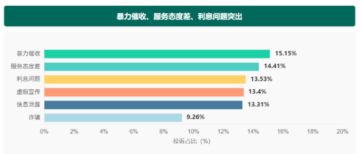 更令人心惊的是投诉问题:暴力催收以15.15%的占比位居榜首,加上服务态度差(14.41%)、利息问题(13.53%)、虚假宣传(13.40%),四大顽疾合计占比超56%。