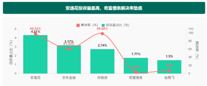 在品牌投诉榜上,安逸花以4.31%的占比高居第一,京东金融(3.17%)紧随其后,而奇富借条(原360借条)虽然投诉占比1.77%,但解决率仅3.36%,垫底行业——这意味着一百个投诉中,仅三个能得到回应。
