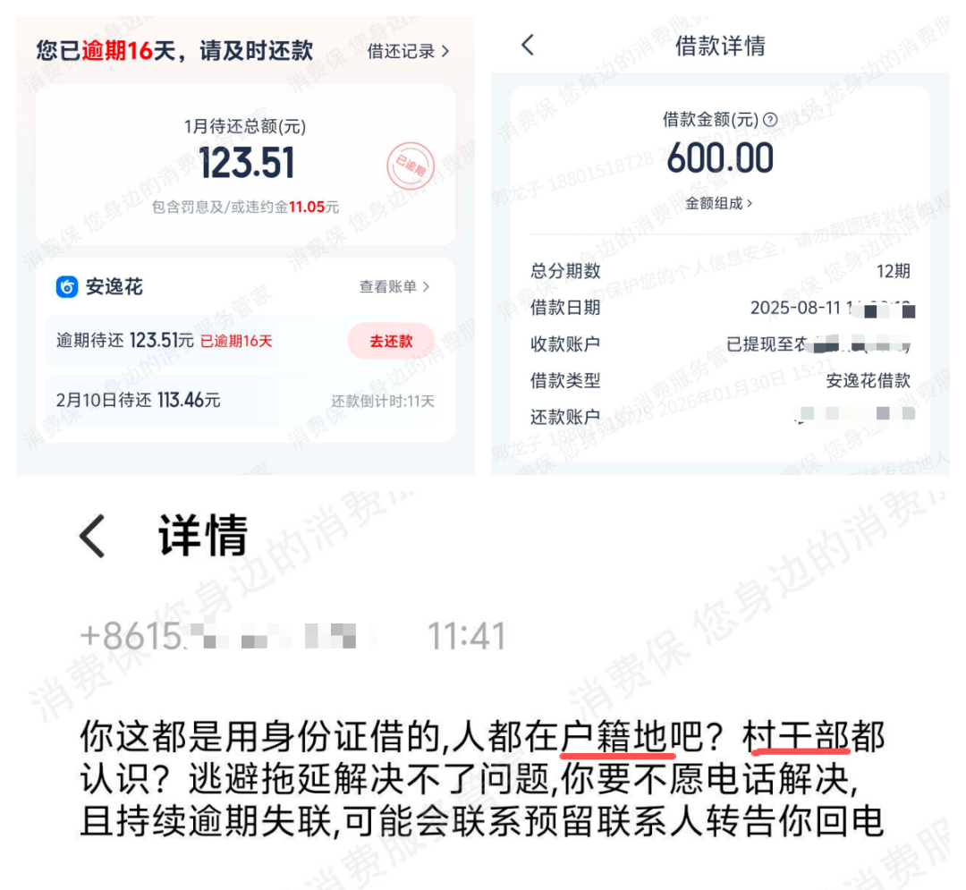 许先生在消费保平台投诉称,2025年上半年其在安逸花借款67008.89元周转,因家人生病、个人失业逾期。尽管他“从未失联,24小时开机积极沟通”,但迎接他的是多地区不明号码的辱骂及短信威胁。