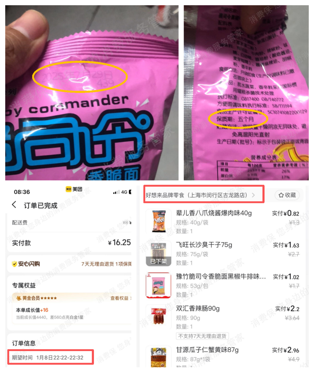 无独有偶,2026年1月8日,消费者黎先生投诉称,在美团买的脆司令干脆面,“吃了一半发现味道不对,一看日期,购买当天已过期”,其食用后出现呕吐、身上发痒等症状。