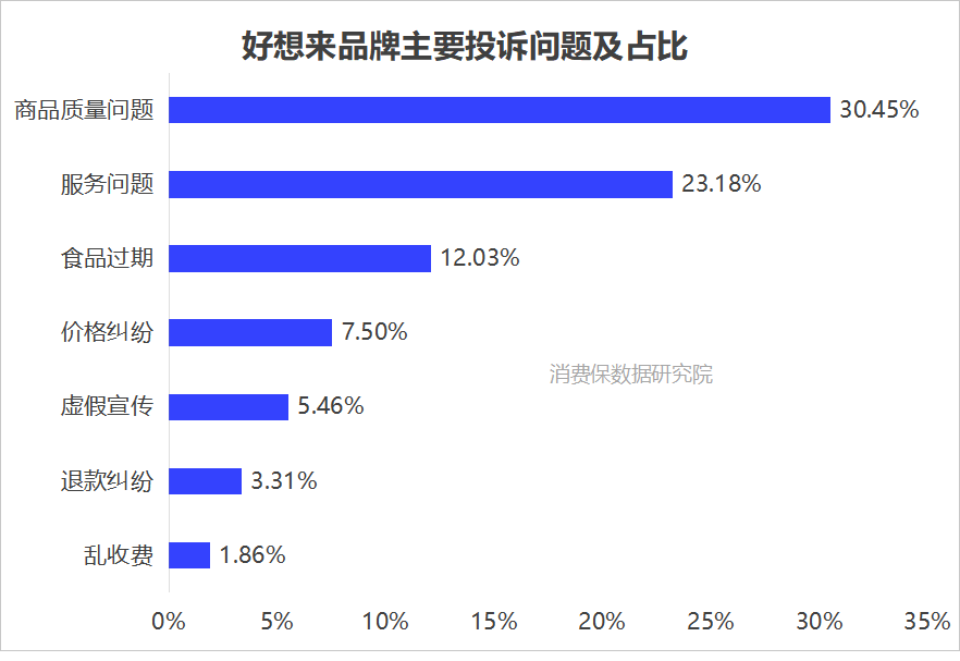 据统计,好想来品牌的投诉中,商品质量问题以30.45%的占比高居榜首,服务问题23.18%紧随其后,二者合计超过五成。食品过期、价格纠纷、虚假宣传同样位居前列。