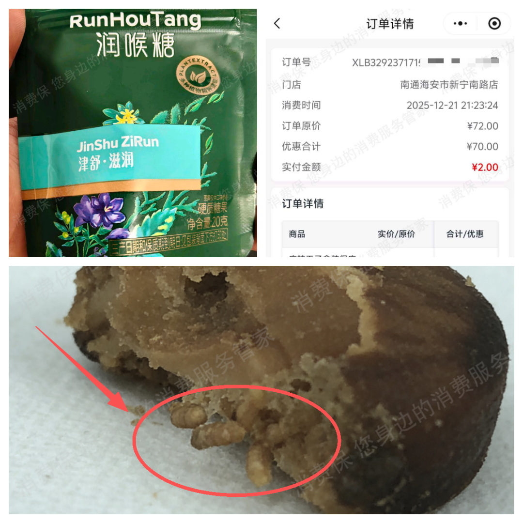 2025年12月21日,消费者崔女士在好想来(南通海安市新宁南路店)购买了一包草本润喉堂,“拆开吃了两个之后,第三个明显口感不对,吐出来发现里面有虫卵。”
