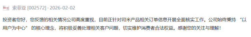 截至发稿,索菲亚仅在其投资者互动平台表示“正开展全面核实工作”。