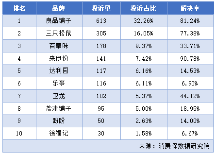 其中良品铺子以613件投诉、32.26%的占比位居榜首,三只松鼠(305件)、百草味(178件)位列其后。