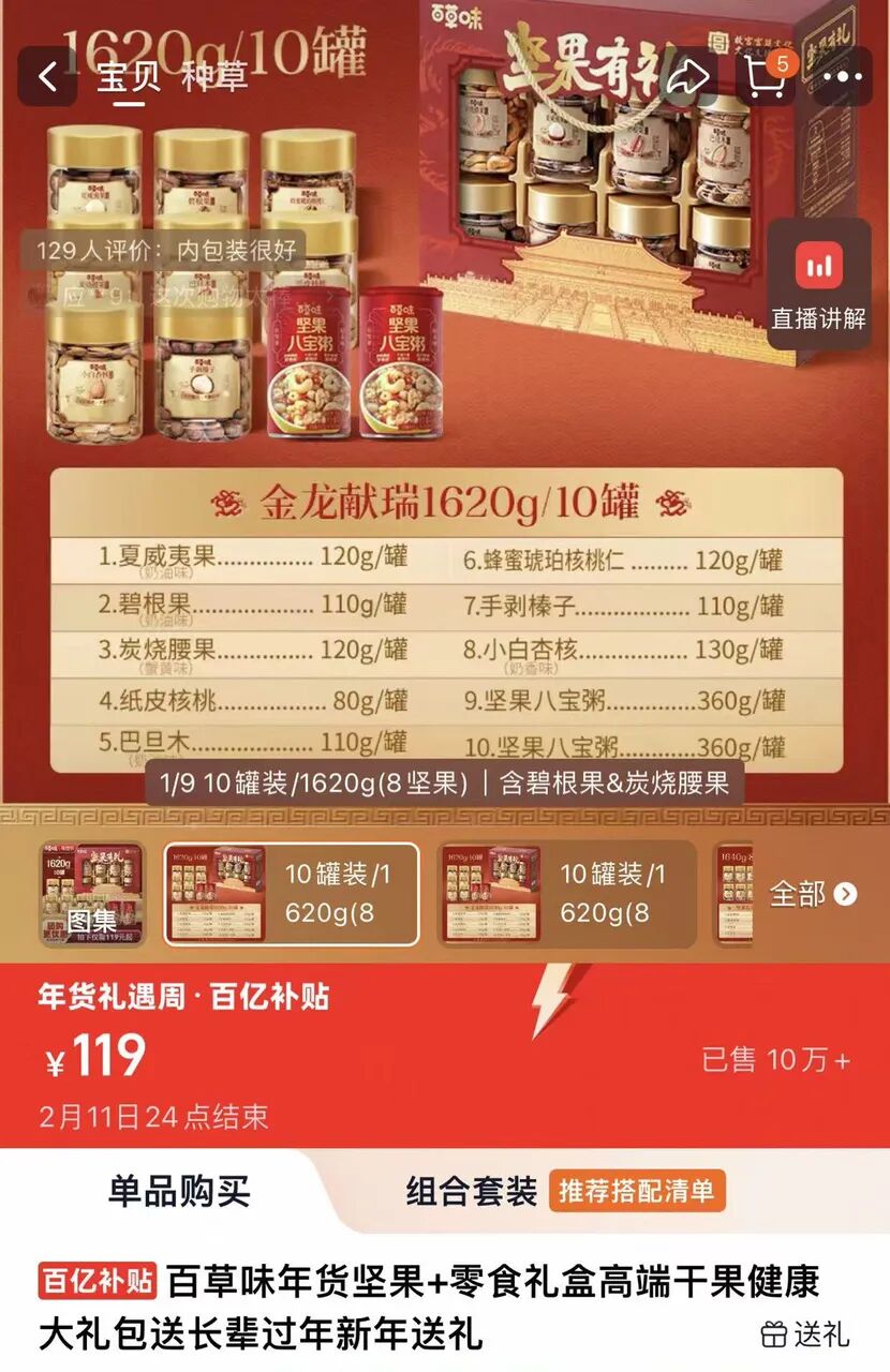 百草味旗舰店一款“金龙献瑞”坚果礼盒(1620g/10罐),两罐“坚果八宝粥”占重近一半,但无论在礼盒包装还是商品链接,都有刻意淡化之嫌。