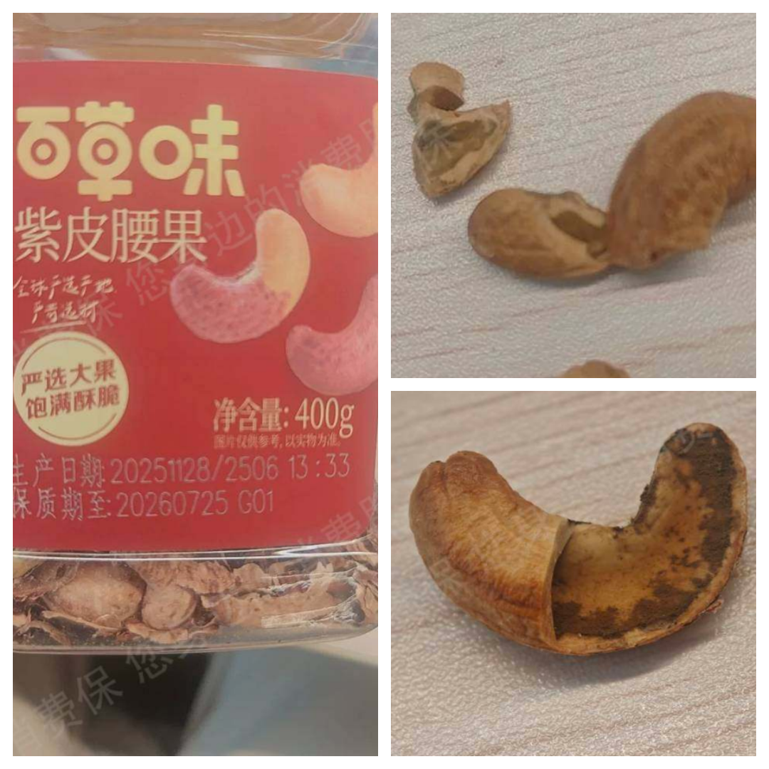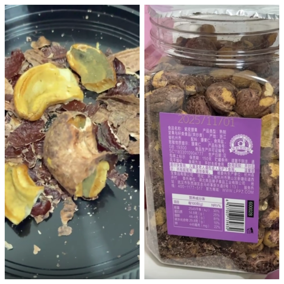 2025年11月,消费者谢先生在拼多多良品铺子官方旗舰店购买500g紫皮腰果,签收当晚打开即发现严重发霉。