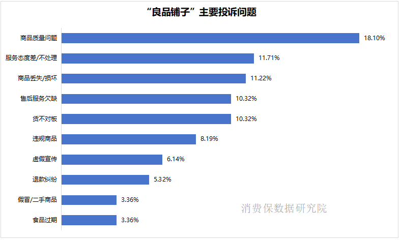 具体到良品铺子,商品质量问题占其投诉总量的18.10%;服务态度差、商品丢失/损坏、售后服务欠缺问题虽也排名靠前,但三者合计占比不足四成。