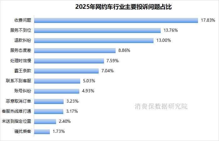 网约车行业投诉问题中,收费问题以17.83%的占比位居榜首,是消费者反馈最集中的痛点;服务不到位(13.76%)、退款纠纷(13.00%)紧随其后,三者合计占比达44.59%。整体反映出费用合理性、服务质量与问题响应效率的短板,是行业投诉高发的主要诱因。