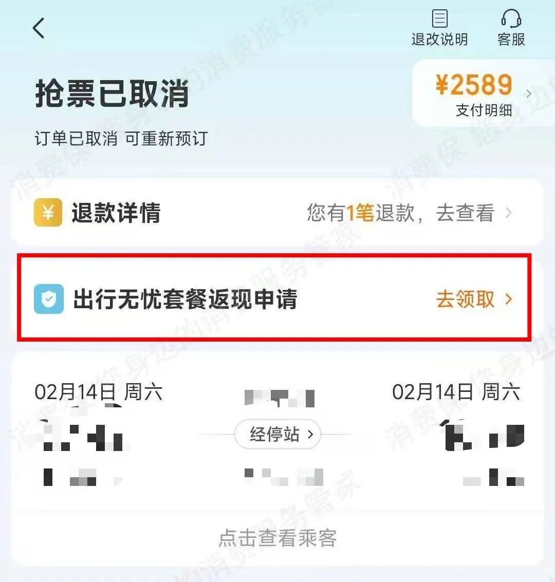 票还没抢到,为什么不退款?刘女士立即查看了“出行无忧”套餐的规则说明,其中提到:若因任何原因导致的购票失败,本套餐费用将自动退回您原支付账户或由您主动领取同等金额返现。刘女士这才注意到,退款界面还有一栏名为“出行无忧套餐返现申请”的入口。