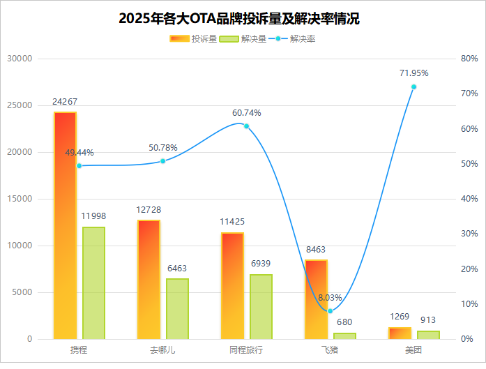 2025年,携程的投诉量在三大品牌中最高,达到OTA(在线旅游)行业24267件,远超其他平台。