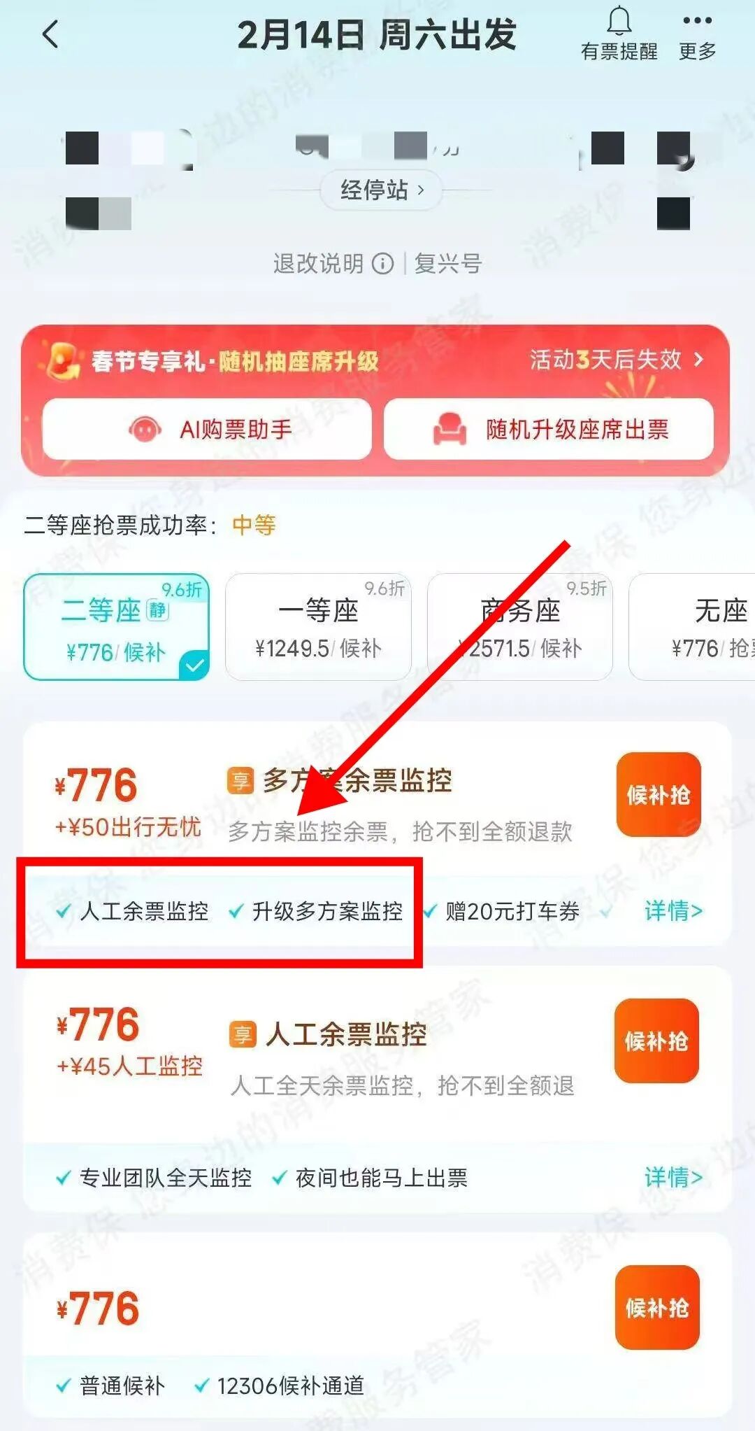 2月8日,消费者刘女士在消费保平台发起投诉,称其在去哪儿平台抢票,发现购票时推送了一个“出行无忧”套餐。该套餐宣称含“多方案余票监控”“人工余票监控”,成功率更高,基于此宣传内容,刘女士勾选购买了该套餐。