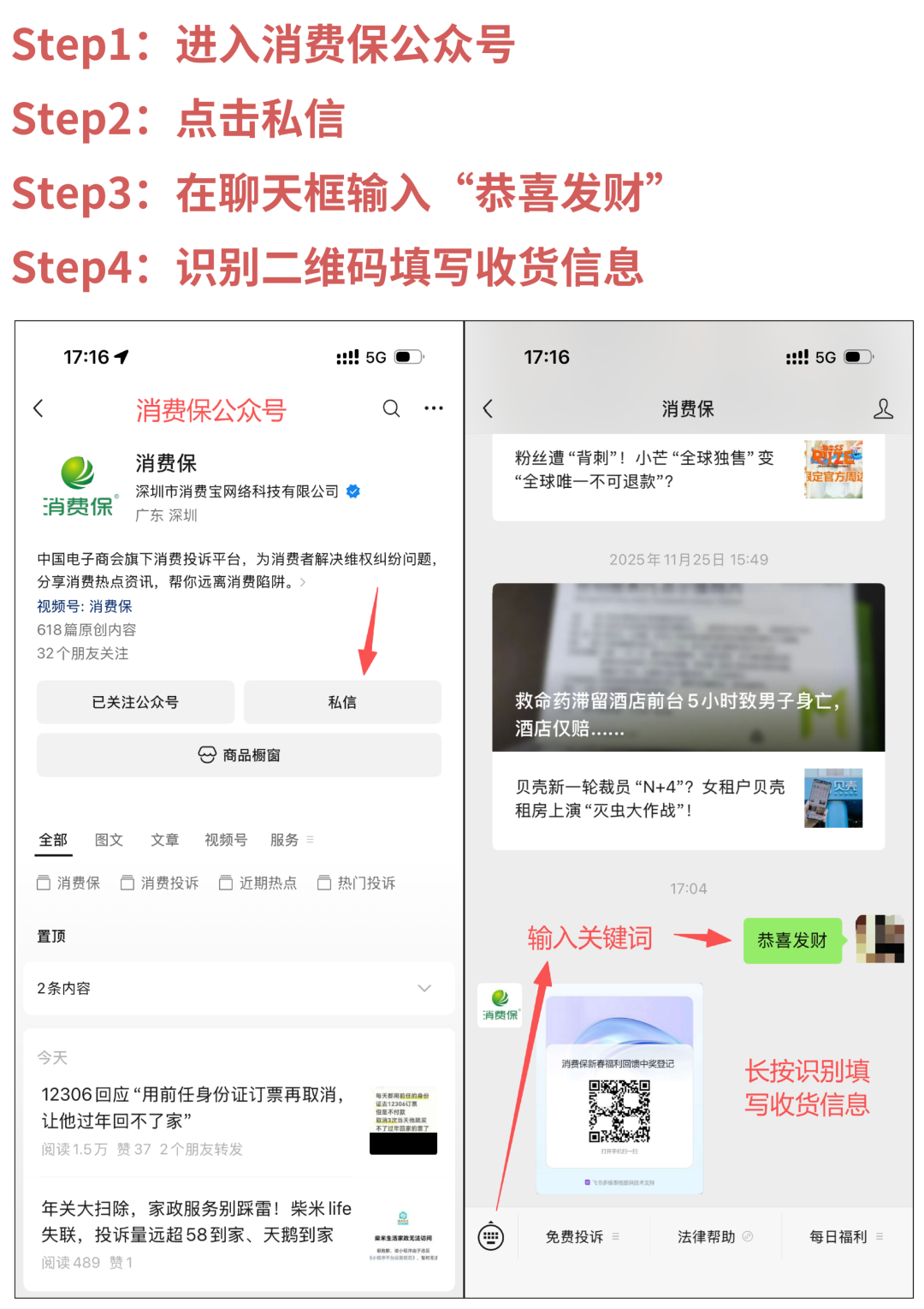 请获奖用户及时在消费保公众号填写收货信息(消费保公众号公布奖品时会附上填写收货信息指引),奖品包邮到家,2月28日23:59前未填写视为放弃奖品,为防止奖品冒领情况,请获奖人务必以中奖手机号作为收货手机号,该手机号将作为是否有效收货信息的判断标准。