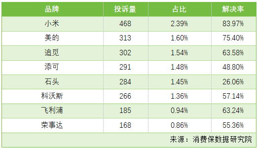 在小家电知名的品牌中,小米投诉量以468件位居首位,投诉解决率达83.97%;美的、追觅分别以313件、302件投诉排名第二、第三。