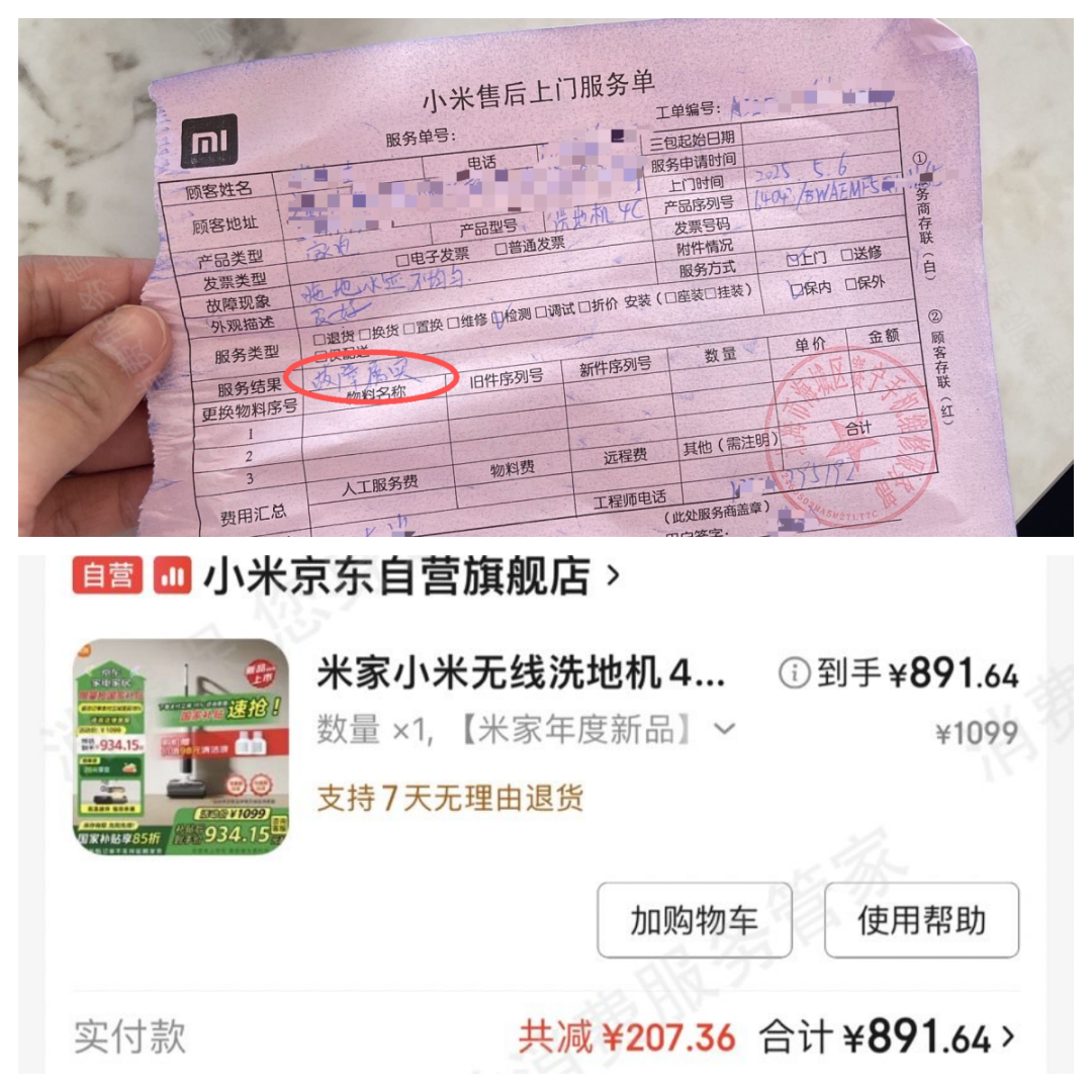 2025年3月12日,消费者唐女士在京东购买了一台891.64元的小米洗地机,几天后出现故障,京东售后于3月27日换新。然而新机“一样出现大大小小的故障,出水不均衡,吸水功能失灵”。5月6日京东上门检测确认故障属实,最终退款。