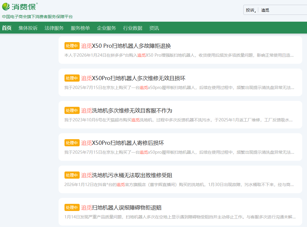 这并非孤例。在消费保平台检索“追觅”,质量问题投诉不少:基站漏水、拖布故障、组件异常……这些故障与春晚舞台上X60 Pro展示的黑科技形成荒诞对照。