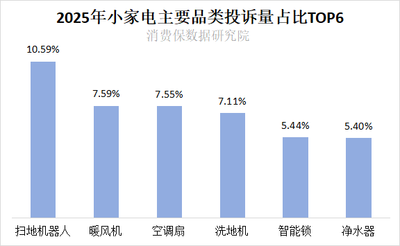 在扫地机器人这一细分赛道,投诉更为集中。消费保数据显示,扫地机器人以10.59%的占比位居小家电投诉品类首位,加上洗地机(7.11%),地面清洁类产品合计占比达17.70%,是投诉重灾区。