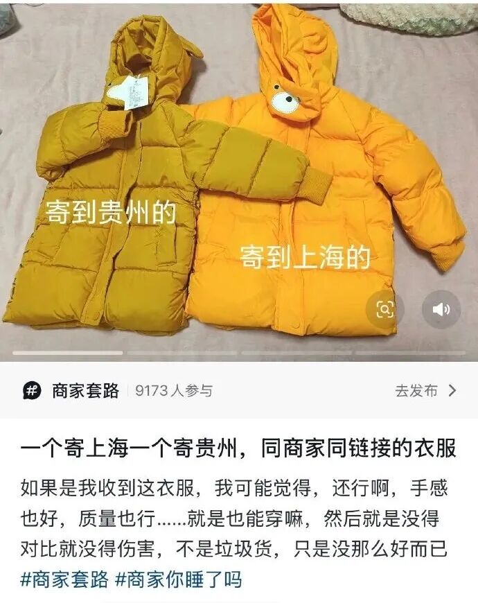 一位网友发帖称,她在同一家店铺的同一个商品链接下,购买了两件同款羽绒服,分别寄往上海和贵州,收到的商品差异令人意外。