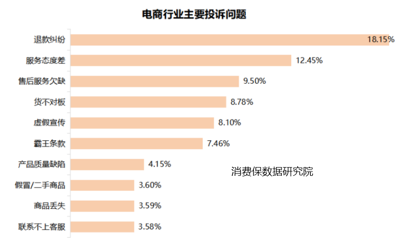 据数据统计,电商行业主要投诉问题集中在退款纠纷、服务态度差、售后服务欠缺、货不对板等方面,其中退款纠纷占比为18.15%,服务态度差次之,占比为12.45%。