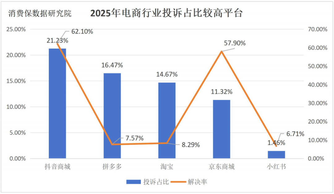 据消费保平台数据,2025年,消费保平台共收到电商行业相关投诉763,717件,投诉解决量243,221件,涉及金额11.09亿元,投诉解决率为31.85%。