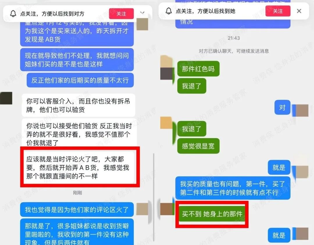 随后,苏女士提到一个细节,白色大衣收货地址填的是市区,而黑红两件大衣是在老家。她当即想到网络上热议的AB货现象。于是,苏女士在商品评价处私信其他消费者询问是否有类似经历,也有部分人回应了苏女士的想法。