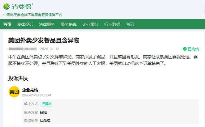 值得关注的是,刘文祥麻辣烫爆火的同时,相关消费纠纷也随之出现,消费保投诉平台收到多起与之相关的投诉。其中,北京一名消费者反馈,其中午在外卖平台下单刘文祥麻辣烫后,发现商家少发餐品,且菜品中有毛发;联系商家后,对方让其自行找平台客服处理,可平台客服迟迟未解决,订单也被平台自动结束,目前该投诉已处理完毕。