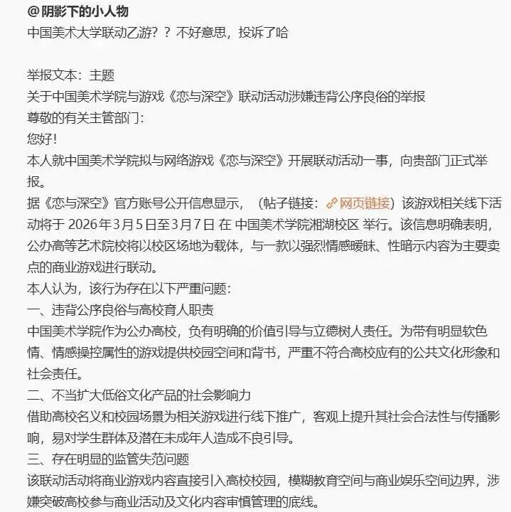 有猜测认为,这与此前《尘白禁区》联动翻车引发的连锁反应有关,玩家之间的“举报大战”让舆情进一步发酵。疑似《尘白禁区》玩家发帖晒出的举报内容称:“为带有明显软色情、情感操控属性的游戏提供校园空间和背书,严重不符合高校应有的公共文化形象和社会责任。”