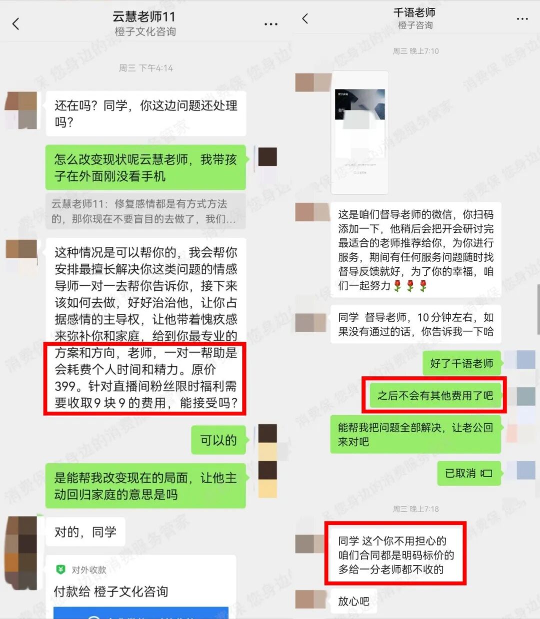 消费者徐女士(化名)正是众多投诉者中的一个。据徐女士反映,2月25日,她在抖音上刷到山东橙子咨询服务的直播,通过抖音群添加了“云慧老师”的微信。云慧老师在沟通中表示,需要安排导师对她进行一对一指导,帮助徐女士挽回婚姻,原价399元的服务,现在直播间粉丝福利价只要9.9元。