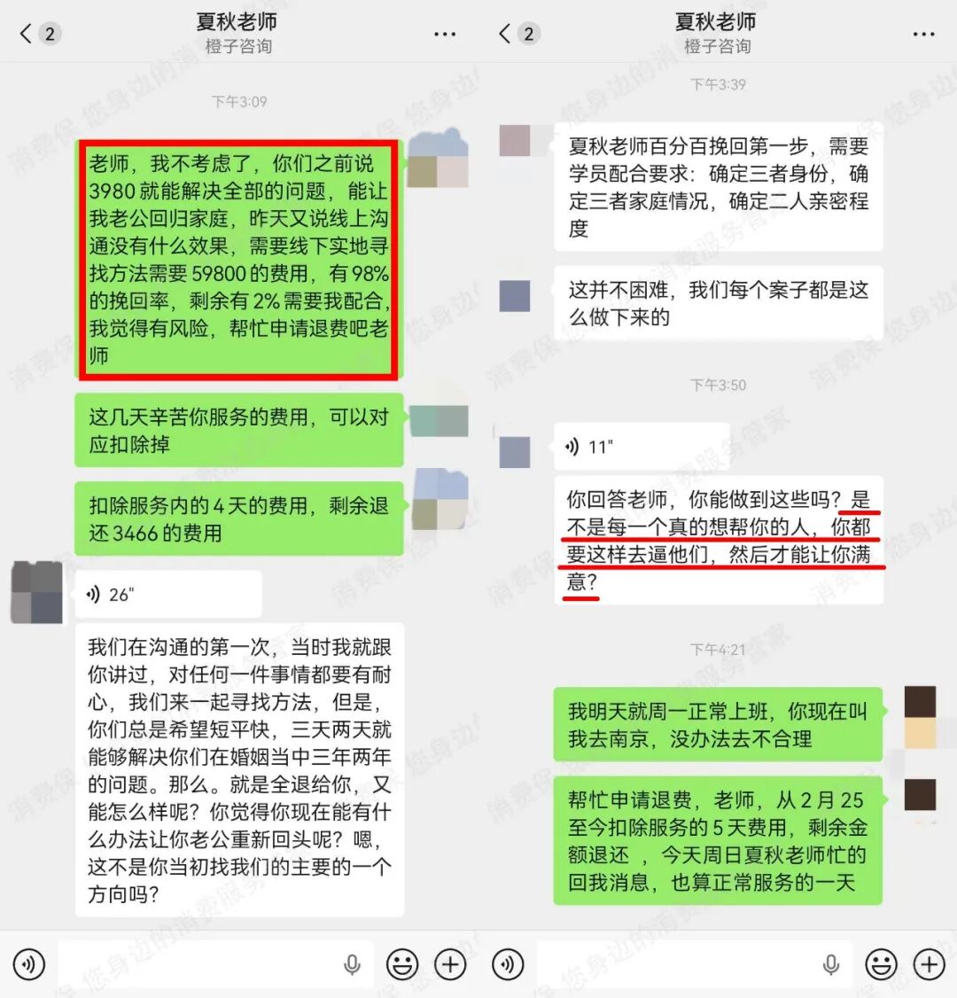 从9.9元到3980元,再到5.98万元,费用层层加码,婚姻关系修复却没有丝毫进展,徐女士终于意识到事情不对劲,于是提出扣除已产生的服务费用后退回剩余款项。不料,遭到对方的拒绝和劝说,夏秋老师甚至语音回复徐女士称“是不是每一个真的想帮你的人,你都要这样去逼他们,然后才能让你满意。”