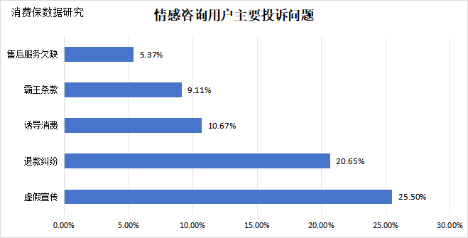 根据消费保平台数据,在情感咨询相关投诉的主要问题中,虚假宣传投诉占比最高,占总投诉量的25.50%,其次是退款纠纷(20.65%),第三是诱导消费(10.67%)。