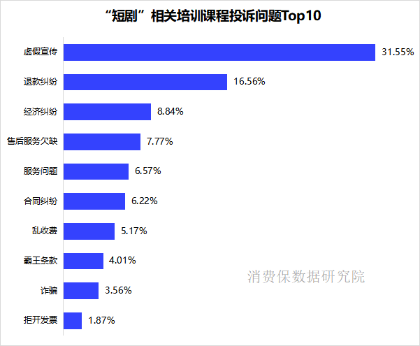 据消费保平台数据显示,2025年1月至2026年2月,平台共受理“短剧”相关培训课程投诉3236件,占短剧相关投诉总量的82.13%。其中,虚假宣传以31.55%的占比高居投诉首位。