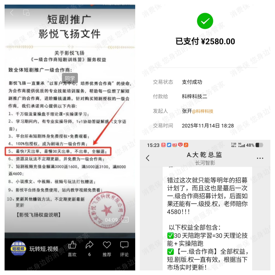 2025年11月,消费者马先生向北京影悦飞扬科技有限公司支付2580元“短剧推广一级授权费”,不到十天,机构又以“AI软件研发成本”为由要求再交2580元,声称“不交就会彻底落下,影响赚钱成果”。