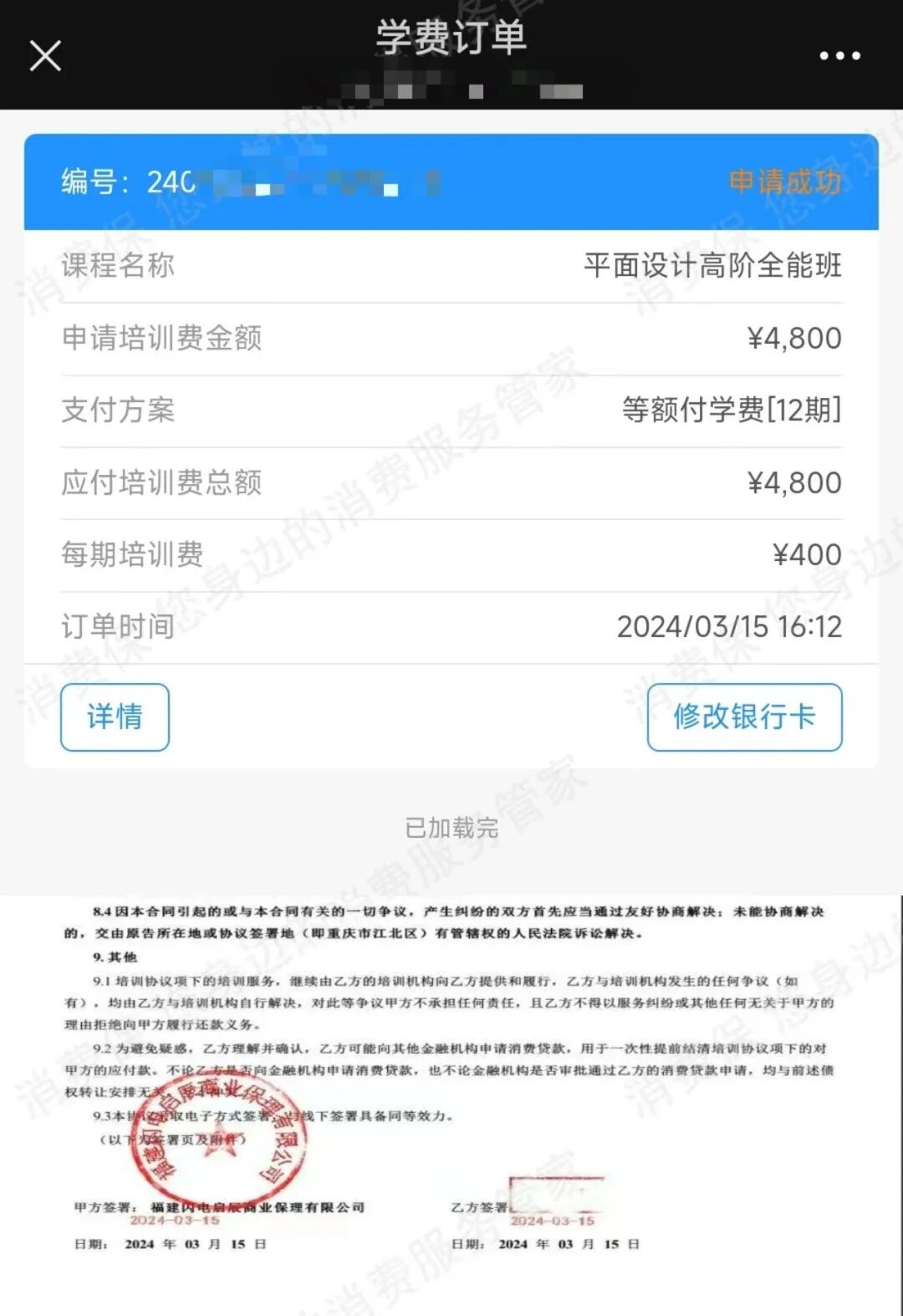 消费者崔女士就是受害者之一。2024年3月,她大学在读期间,刷到山东慧跃咨询服务有限公司的平面设计课程宣传,声称“零基础小白也能学会,学完即可接单赚钱”。添加客服微信后,对方热情介绍课程内容,表示学费可以分期支付,每月只需几百元,接单后很快就能赚回来。在客服引导下,崔女士与助贷平台启辰宝签订了一份4800元、分12期的分期付款合同,并支付了50元开课费。