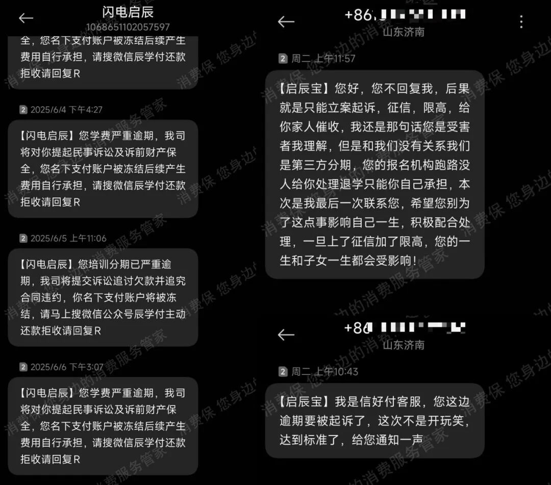 她立即提出退课退款。负责人口头答应取消订单,却并未有所行动,且公司在11月直接注销跑路。第三方催收机构闪电启辰公司却并未停止对崔女士进行持续的短信和电话催收。她表示其中不乏威胁恐吓、起诉等言论,对她的身心健康和学业生活造成了很大影响。