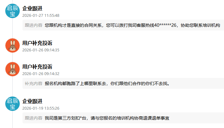 崔女士只好在消费保平台发起投诉,希望终止与启辰宝的分期合同,对方却以“我司是第三方划扣平台,请与您报名的培训机构协商退课退单事宜”回复撇清责任。