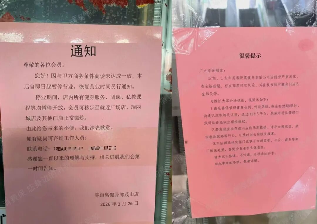 2月26日,消费者杨女士就发现自己充值了游泳课程的零距离健身郎茂山店突然关闭了,门口粘贴着大大的“旺铺招租”刺痛了她的双眼。2024年1月,她在该店购买了11600元的游泳长训课,共计200余节,协议写明无时间限制,陆续已上32节。年前,杨女士还看到商家张贴的过年放假通知,年后回来却只看到一张红纸告知资金链断裂,无法继续经营,全市门店均已关闭,至于未使用的课程退费更是无从谈起。