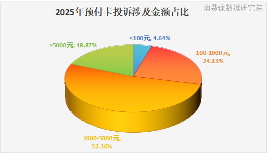 消费保数据显示,预付卡相关投诉中,52.36%的投诉金额集中在1000-5000元,其次是100-1000元之间,占比24.13%,5000元以上的占比为18.87%,涉及金额较大。