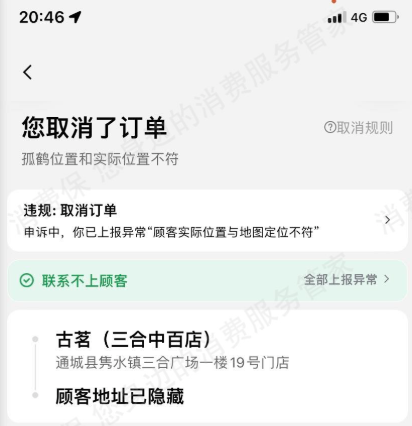 3月24日,骑手伍先生接到古茗(三合中百店)订单,却发现顾客实际位置与地图定位严重不符,多次拨打电话均无人接听。因无法确认准确送达位置,伍先生被迫取消订单,结果平台不仅未结算配送费,还将其判定为“违规取消订单”并记罚。