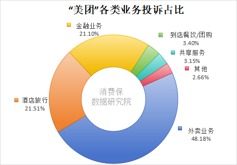 从业务分布看,投诉高度集中于三大核心业务:外卖业务以48.18%的占比位居首位,接近总量一半,是投诉最多的板块;酒店旅行(21.51%)与金融业务(21.10%)紧随其后,三大业务合计占比超九成。