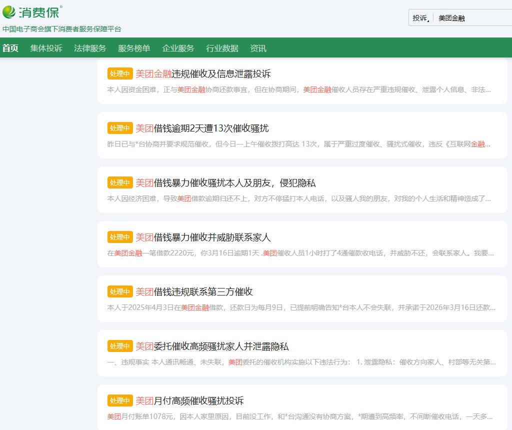 在消费保平台搜索可见,美团金融服务的暴力催收、泄露隐私、贷款利率及罚息过高等问题投诉频发。