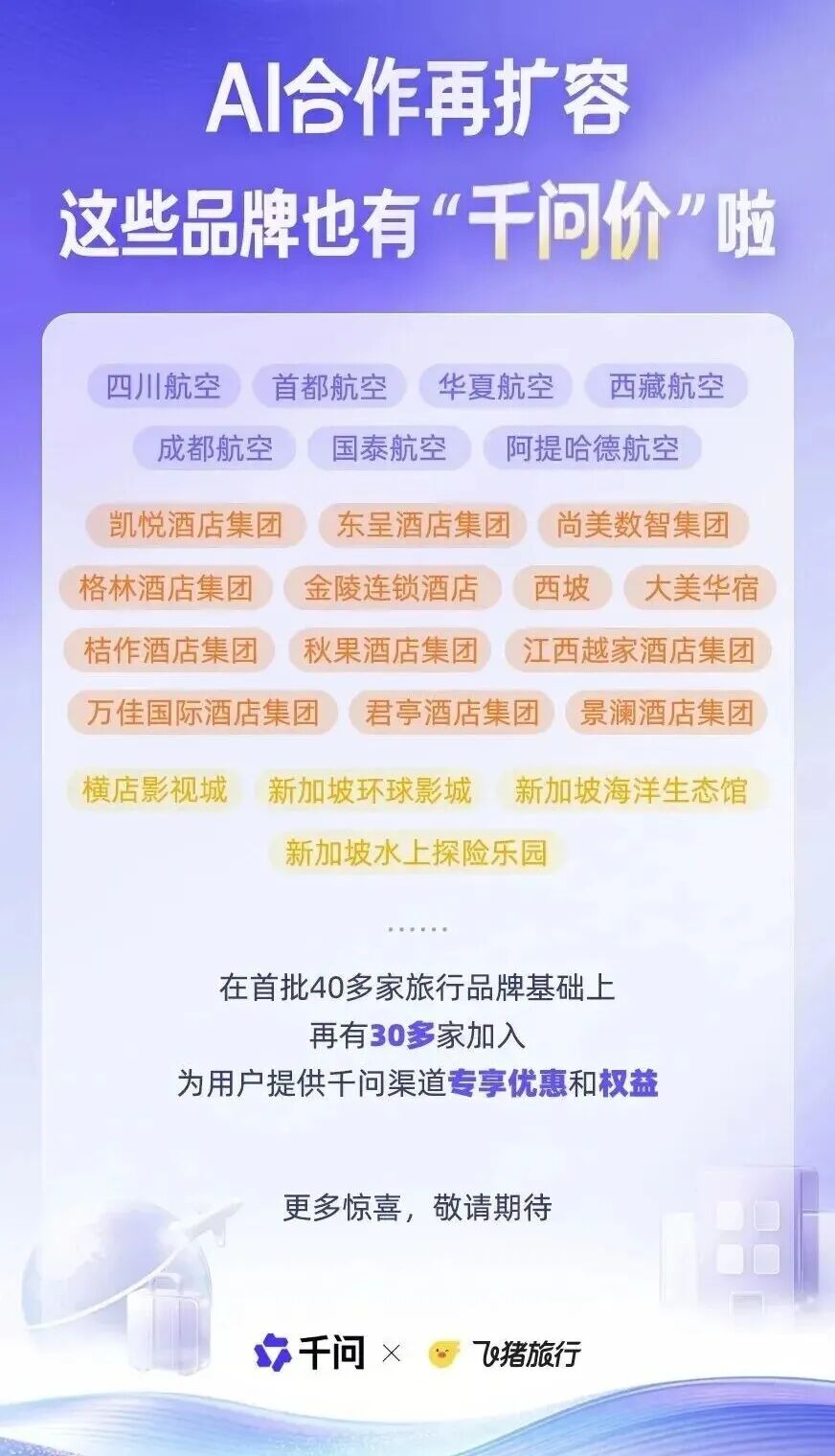 近期,飞猪的AI化动作引发了不少关注。4月2日,飞猪与通义千问宣布再与30多家旅行品牌达成AI合作,至此已合作的国内外品牌总数超过80家。四川航空、凯悦酒店、横店影视城等品牌纷纷加入“千问价”阵营。