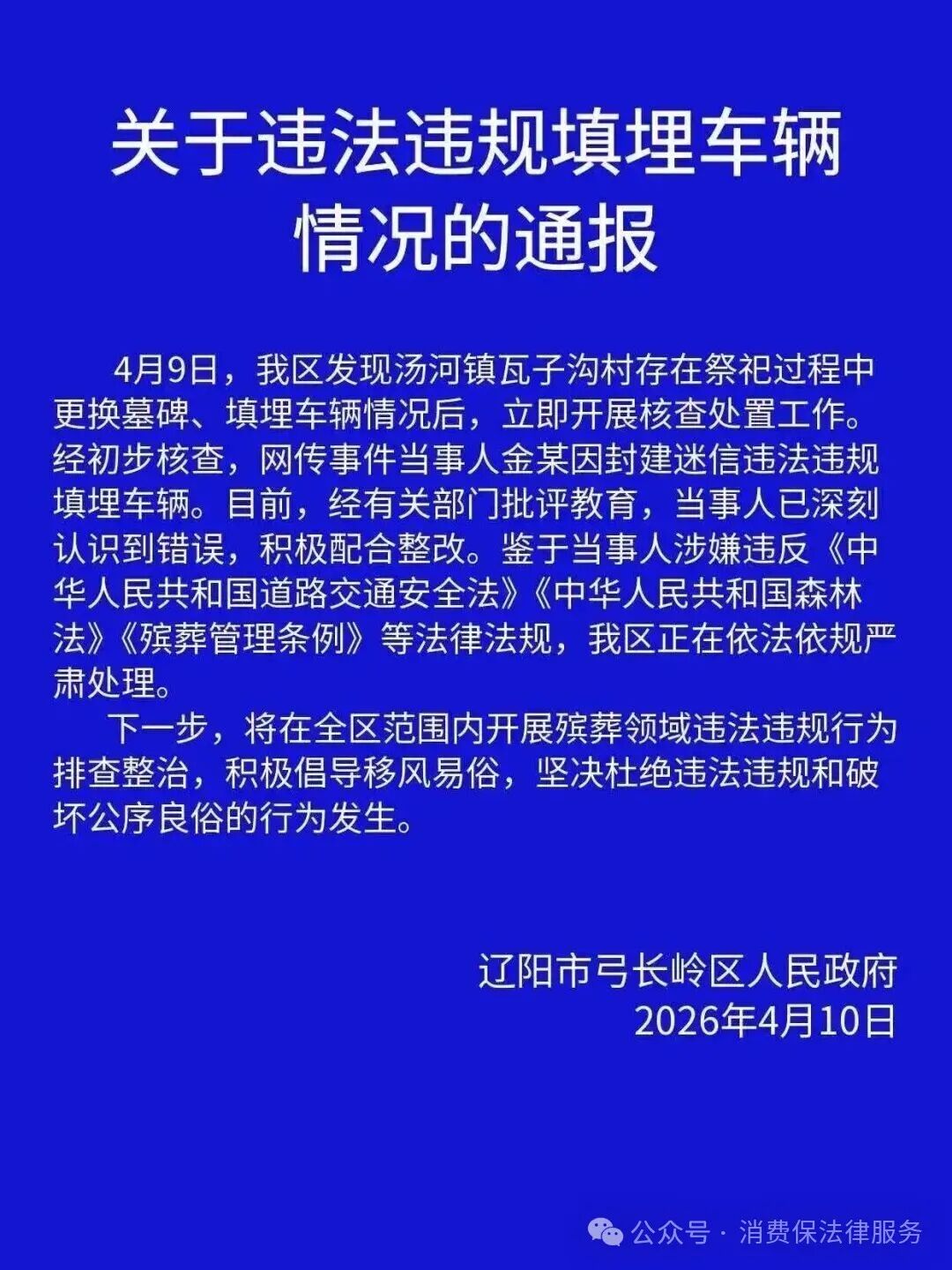 4月10日,辽阳市弓长岭区政府发布《关于违法违规填埋车辆情况的通报》:
